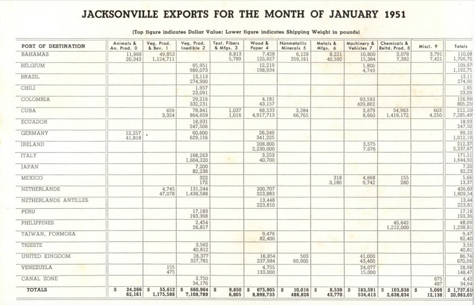 Jacksonville vegetable, produce, and inedible exports for the month of January 1951 (summarized)