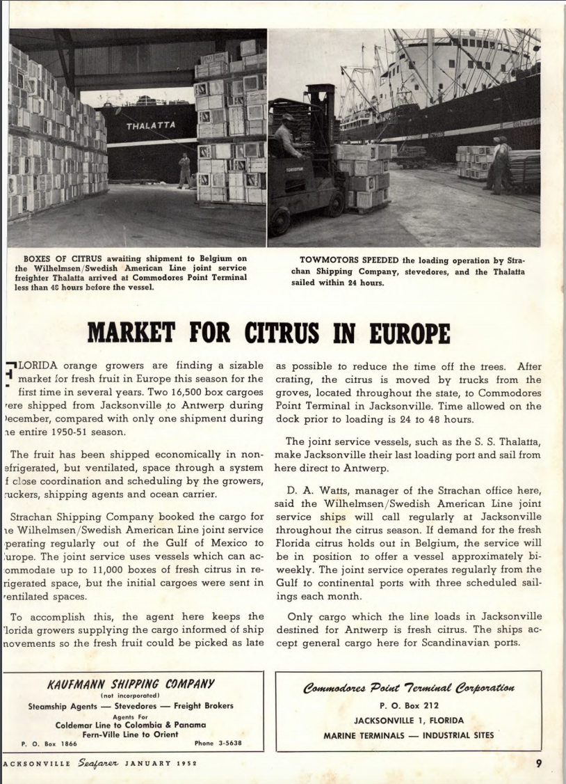 D.A. Watts, manager of the Strachan office in Jacksonville, said the Wilhelmsen/Swedish American Line joint service ships will call regularly throughout the season, however, if Belgium’s demand for oranges remains constant, the service may expand to offer vessel shipments approximately bi-weekly.