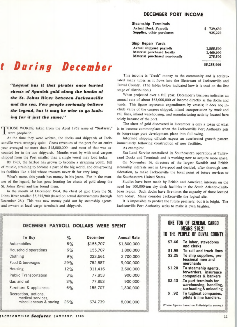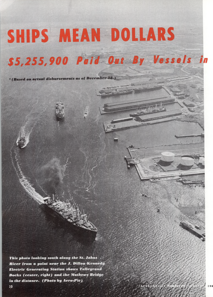 The Port of Jacksonville saw December 1964 revenues totaling $5,255,900 (approximately $43.3 million in 2019). This new money paid out by steamship agents and owners at local cargo terminals and shipyards provides “fresh” money for the city of Jacksonville and the rest of Duval County.