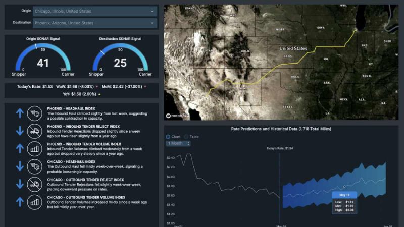 SONAR is a freight market analytics dashboard that is often compared to a financial market software system like the Bloomberg terminal or Refinitiv’s Eikon offering. The subscription-based offering helps transportation and logistics providers, shippers, and financial traders and analysts gain unprecedented access to real-time market data on the global logistics market. Most of the data on the SONAR platform is proprietary and offered exclusively by FreightWaves.