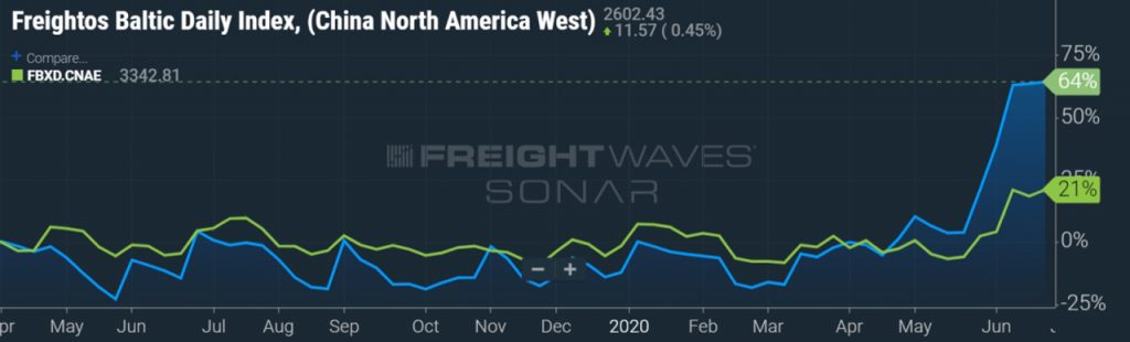 Chart by FreightWaves SONAR: Daily rates per forty-foot equivalent unit from China to the U.S. West Coast (blue) were up 57% year-on-year as of July 1, whereas rates from China to the East Coast (green) were up only 16%.