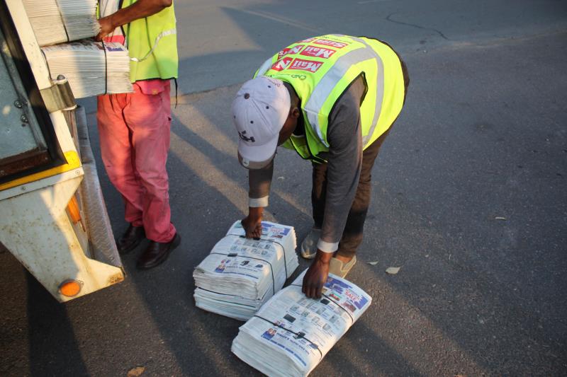 Distribution runners appear, seemingly from nowhere, to load the heavy bundles, while supervisors with clipboards and drivers check the quantities.