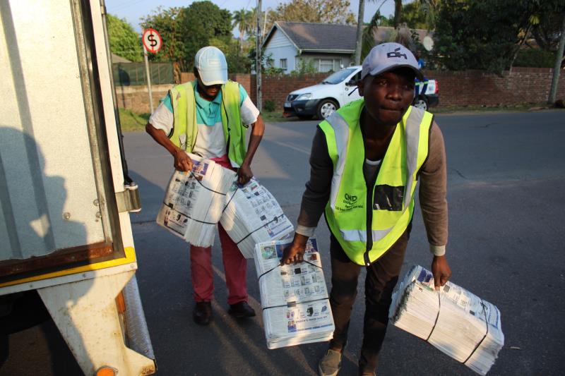 It’s early morning and The Highway Printers’ entrance in New Germany is a hive of activity, with distribution company CND’s trucks rolling in to collect the bundles of Caxton Local Media’s newspapers for distribution.