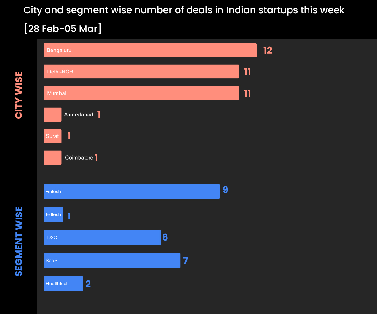 Fintech was the top segment in terms of the number of deals as 9 startups in this space raised $71 million. SaaS, D2C brands, healthtech and edtech were the next on the list in terms of the number of deals.