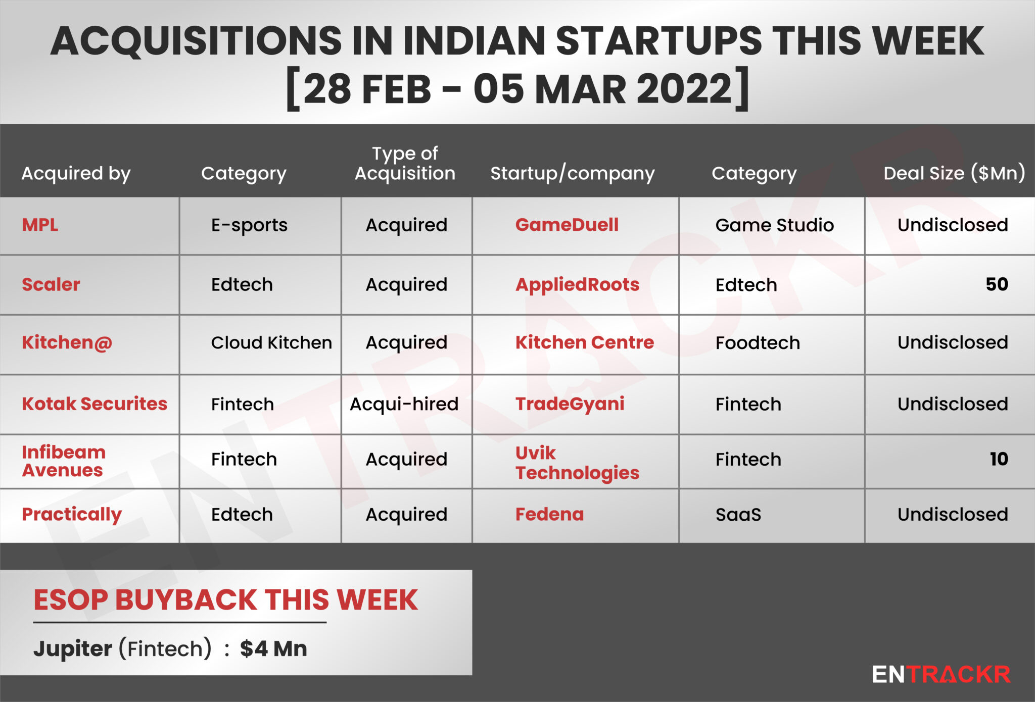 The week saw six acquisitions. The acquisition of online learning platform AppliedRoots for $50 million and Uvik Technologies by Infibeam for $10 milion were two disclosed deals on the list.