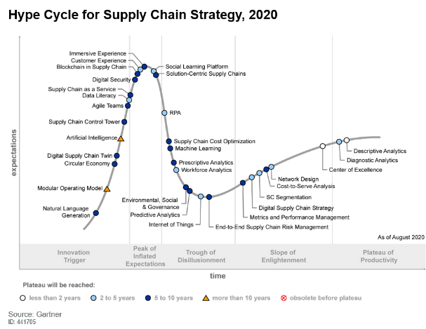 The Gartner Inc. 2020 Hype Cycle for Supply Chain Strategy shows that the Internet of Things (IoT) has reached the bottom of the Trough of Disillusionment. The market will begin to climb out of this trough, as the technology advances and practitioners succeed in defining the best opportunities for the unique measurement and tracking capabilities of IoT.