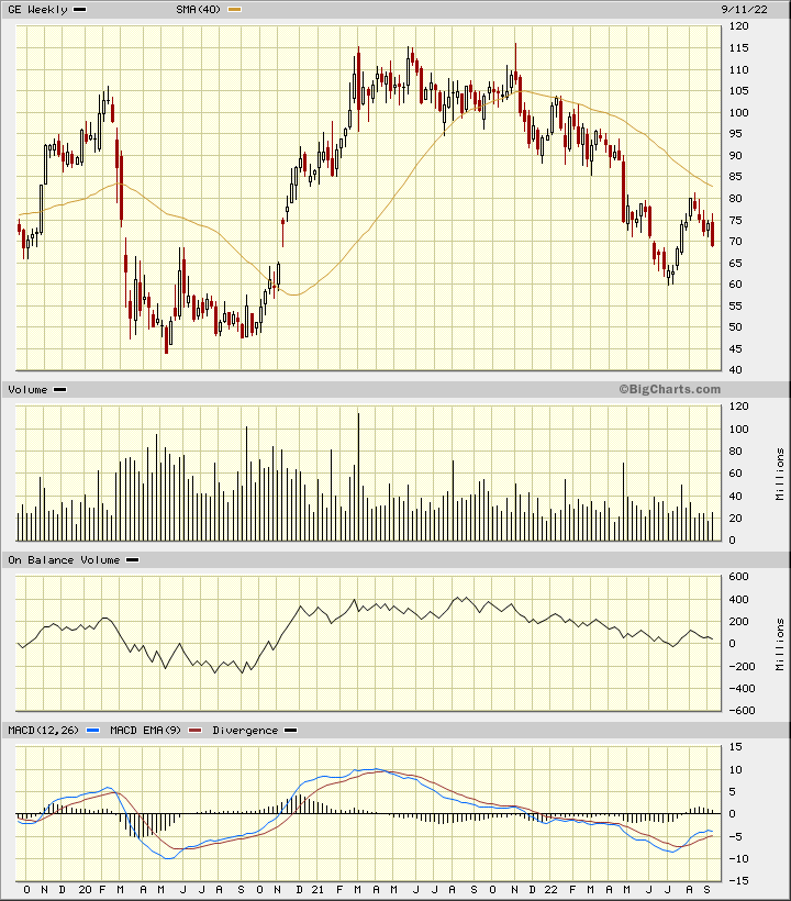 In the weekly Japanese candlestick chart of GE, below, we can see a bearish condition even though this week’s candle has not yet been plotted. Prices are trading below the bearish 40-week moving average line.