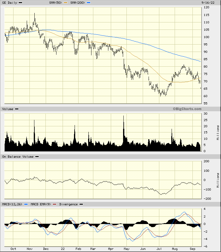 In the daily bar chart of GE, below, we can see the price action as of Friday’s opening. The shares have gapped lower and are trading below the 50-day and the 200-day moving average lines.