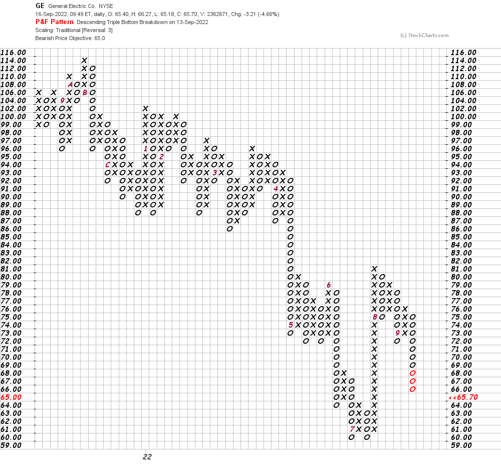 In this daily Point and Figure chart of GE, below, we can see a downside price target of $65 and the support at $60 is not that impressive.