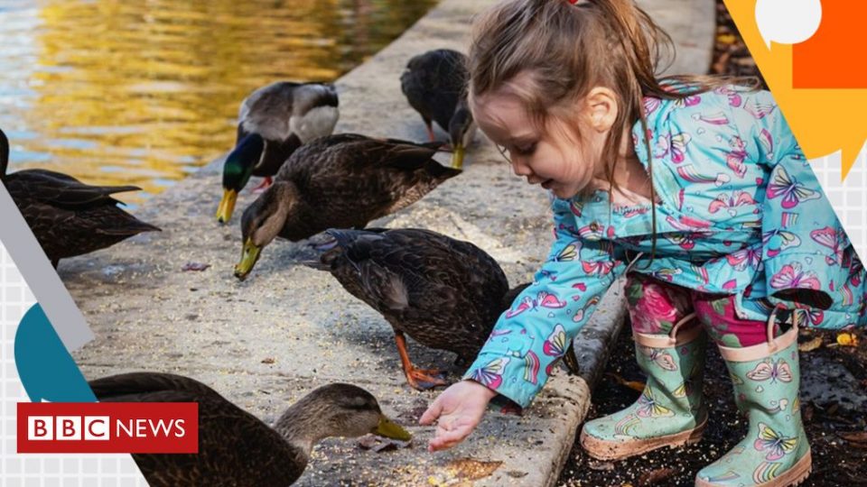 A girl feeding ducks