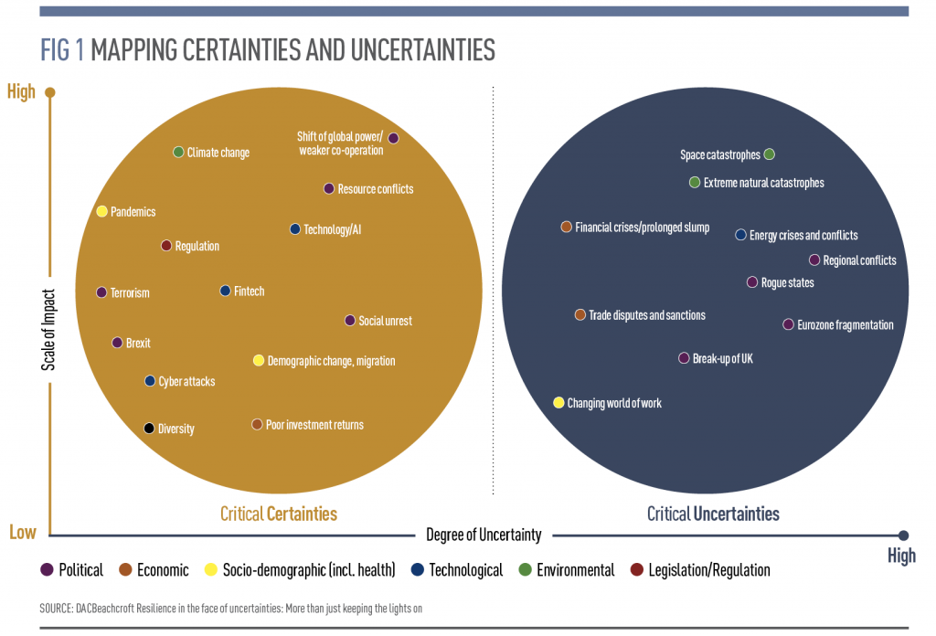 Many scenario planning tools categorise each risk as is plotted on their matrix or across their horizon. This helps highlight the sort of knowledge and expertise needed to understand the issues. The most common categorisation is PESTEL (Political, Economic, Socio-demographic, Technological, Environmental and Legislative). This also makes it easier to see the potential connections, how one event can act as a trigger for another, something highlighted in a recent Informed Insurance report from leading corporate law firm DAC Beachcroft.
