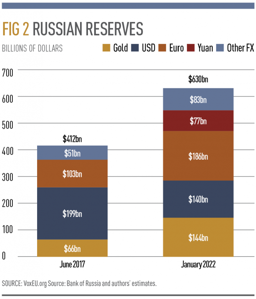 The tough sanctions imposed on the large foreign currency reserves Russia has built up caused many a sharp intake of breath across the international money markets, but perhaps were only to be expected once the major western economies and Japan started to move to isolate Russia financially. The freezing of the reserves is directly linked to the desire to limit Russia’s ability to finance its war against Ukraine. The Bank of Russia had accumulated more than $600bn of international reserves, including gold (see Fig 2).