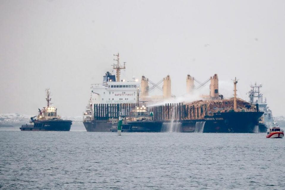 The ship, owned by the Hamburg, Germany-based shipping company NSC, is now being examined by experts who said is timber cargo is still hot and not fully contained.