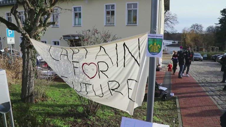 BRANDENBURG, GERMANY — Around 250 Germans protested outside of Berlin today, where the electric car company Tesla plans to build a new Gigafactory.