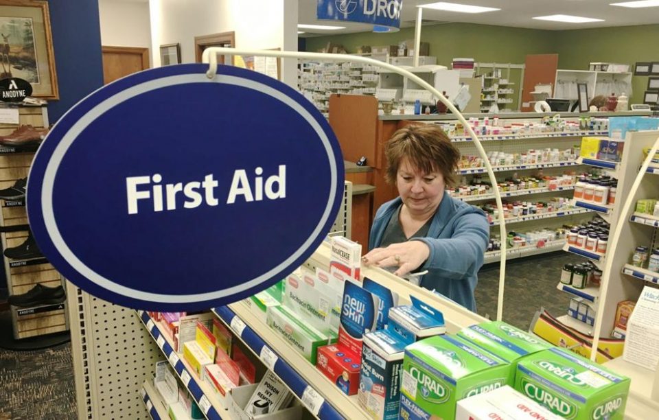 Jan Ballard, a pharmacy technician at The Medicine Shoppe in Hermitage, checks on supplies at the pharmacy on Thursday. Like other drug stores nationwide, due to fears of the coronavirus, formally known as COVID-19, the Hermitage store ran out of face masks two weeks ago and so far hasn’t been able to get in new supplies.