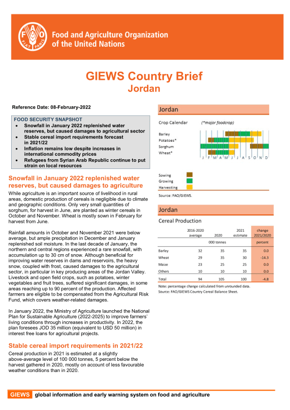 Rainfall amounts in October and November 2021 were below average, but ample precipitation in December and January replenished soil moisture. In the last decade of January, the northern and central regions experienced a rare snowfall, with accumulation up to 30 cm of snow. Although beneficial for improving water reserves in dams and reservoirs, the heavy snow, coupled with frost, caused damages to the agricultural sector, in particular in key producing areas of the Jordan Valley.