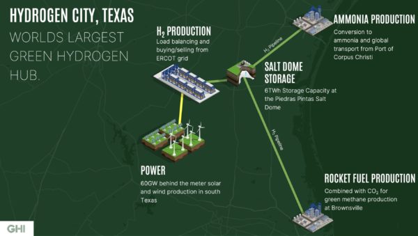 GHI has acquired salt storage rights at strategic sites globally, with a potential for 100 TW hours of energy storage capacity. Hydrogen City is GHI’s first project, and it will be centered on the Piedras Pintas salt dome in Duval County, Texas. It is planned that the green hydrogen will be delivered through pipelines to Corpus Christi and Brownsville, where it will be turned into green ammonia, sustainable aviation fuel, and other products, or it will be delivered by pipeline directly to hydrogen power plants and other users around the state.