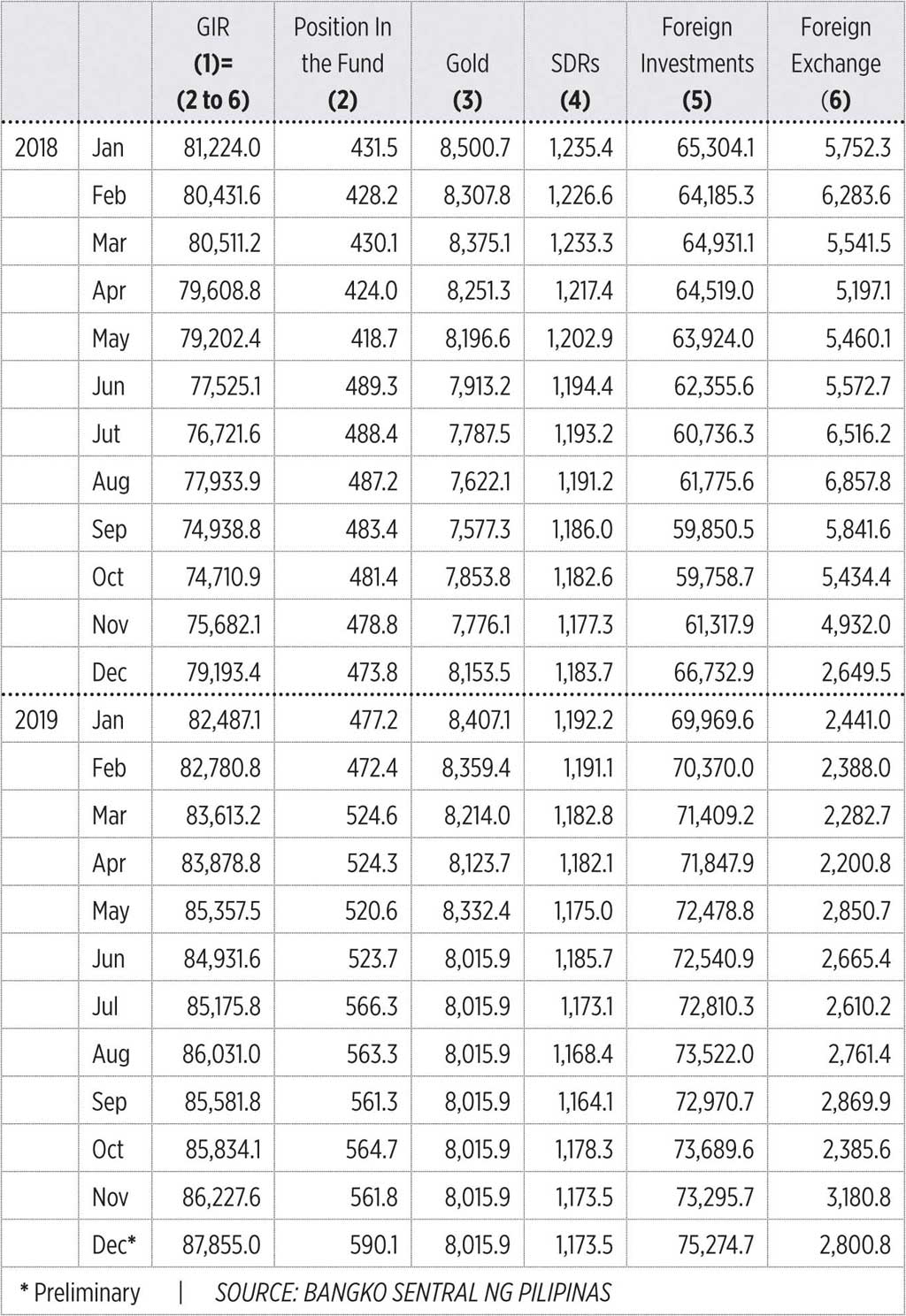 “The end-December 2019 level of the GIR provides an ample external liquidity buffer that is equivalent to 7.7 months’ worth of imports of goods and services and payments of primary income,” the BSP said in a statement.