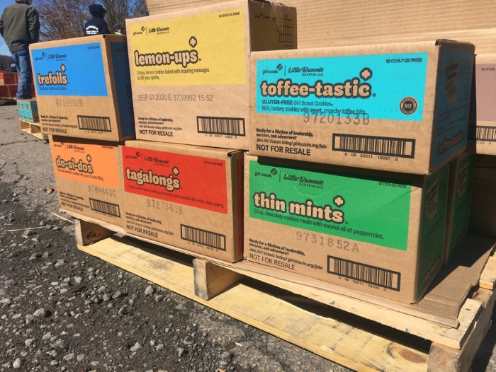 The distribution worked like a big drive-thru. Moving company workers and scouting staffers unloaded shrink-wrapped pallets, unwrapped the cases of cookies and prepared the individual orders for the participating troops. Troop vehicles arriving at designated times drove up and parked in certain spots in the assembly line, and workers packed the cases into the vehicles.