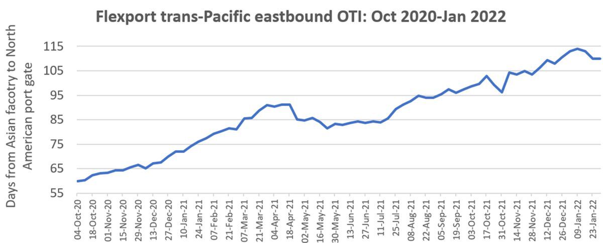 During the week ending Sunday, the OTI indicated that it took an average of 110 days for cargo to get from a factory in Asia to the exit gate of a North American port, the same time it took in late December. The latest transit-time average is down from the record of 114 days in the second week of January, yet still up 42% year on year.