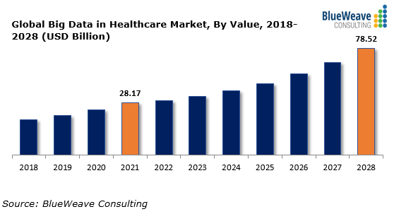 A recent study conducted by the strategic consulting and market research firm, BlueWeave Consulting, revealed that the Global Big Data in Healthcare Market was worth USD 28.17 billion in the year 2021. The market is projected to grow at a CAGR of 15.9%, earning revenues of around USD 78.52 billion by the end of 2028. The Global Big Data in Healthcare Market is booming because of the growing requirement for analysis, integration, and management of enormous volumes of data that propel big data analytics in the healthcare sector. These data are mostly gathered from different electronic health records (EHR) and patient biological information. A set of statistical algorithms and predictive models supported by high-performance analytics platforms make up big data analytics, a subset of advanced analytics. These technologies, which use powerful computing systems, provide the healthcare sector with several commercial advantages including successful marketing, new income prospects, greater operational efficiency, and better patient care. Currently, big data analytics is being adopted by a wide range of healthcare organizations, including multi-provider groups, single-physician practices, and huge hospital networks. This increase can be ascribed to the service’s many benefits, which include its swift and effective detection of healthcare fraud as well as its analysis of patient information and clinical studies.