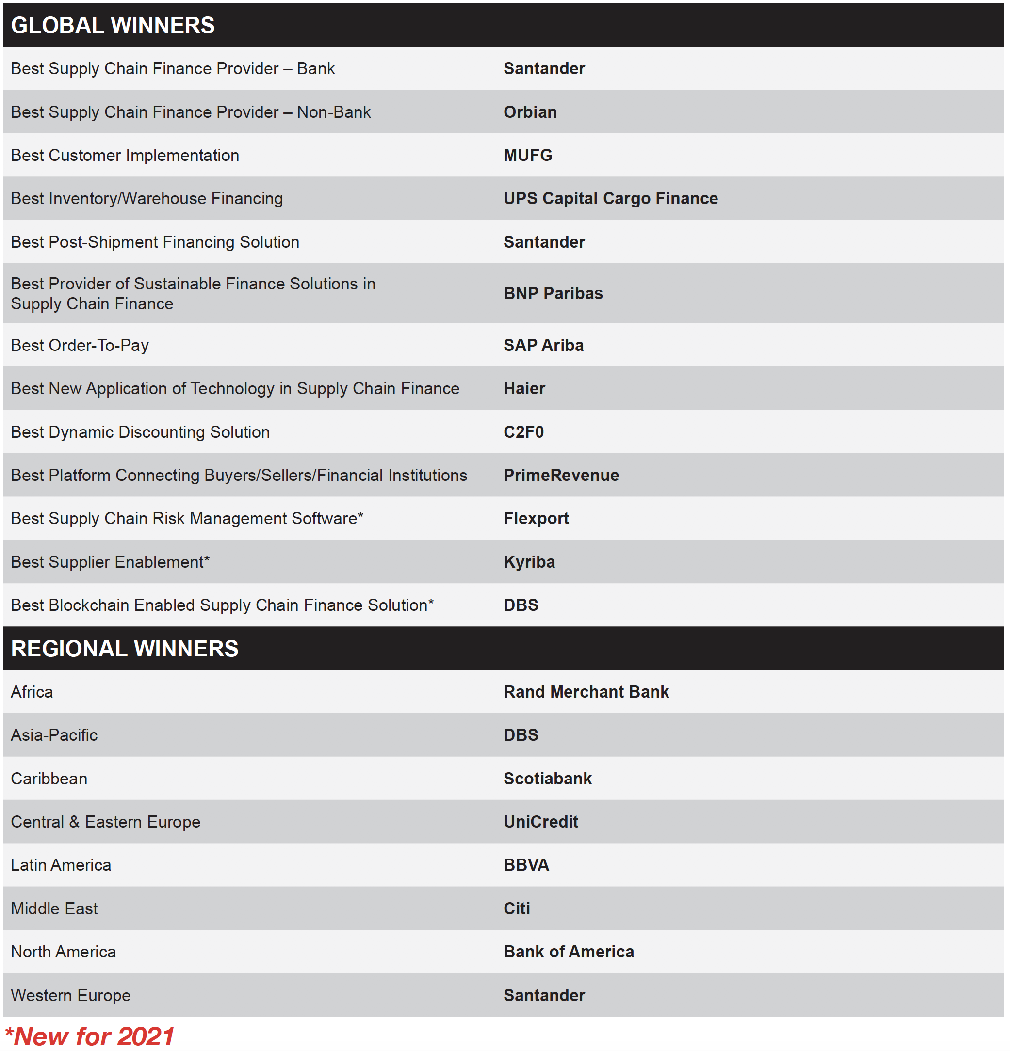 A list of the 2021 World’s Best Supply Chain Finance Providers follows.