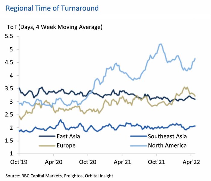 Due to Russia’s invasion of Ukraine, several major shipping lines have suspended transportation into the Baltic and Black Seas. The aggregate turnaround time for the three largest European container ports — Rotterdam, Antwerp and Hamburg — are currently 8%, 30% and 21% above their five-year normal levels, according to RBC’s report.
