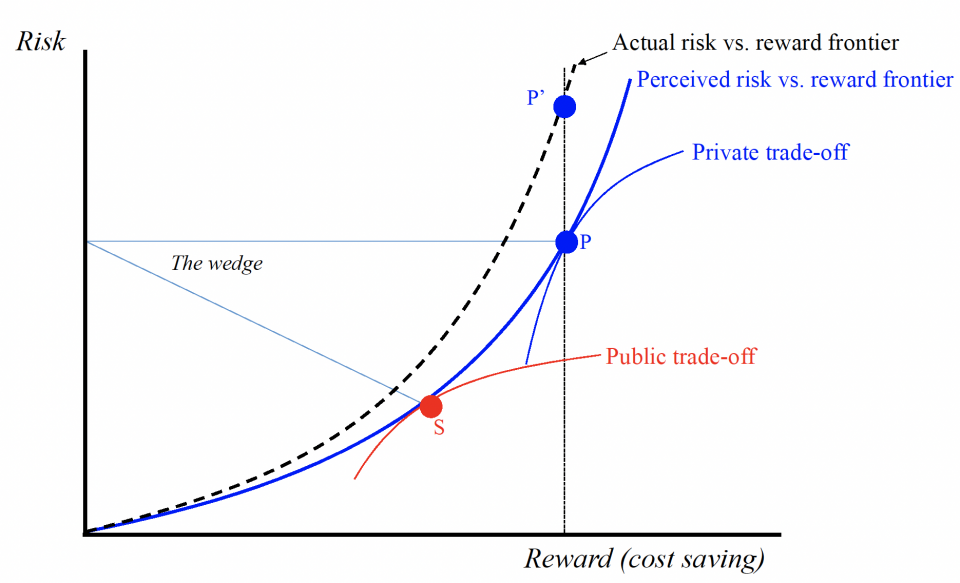 Where does the wedge come from? Public versus private risk appetite. In the GSC world, divergences in public-private risk preferences can arise from a range of mechanisms whereby individual firms do not internalise the full risk of their actions. Private firms optimally choose point P given their preferences. In some sectors, many governments have preferences that give greater weight to risk reduction, so the public trade-off leads to a lower-risk optimum, creating a wedge between public and private risk evaluations. This divergence is clear in sectors such as banking where, in the past, government provided guarantees when the risk went wrong, and in food production where individual producers underinvest in anti-famine actions.