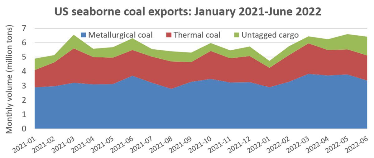 U.S. exports — including both thermal and metallurgical or “met” coal (used for steel production) — totaled 36.2 million tons in the first half, up 6% year on year, according to data from Kpler.