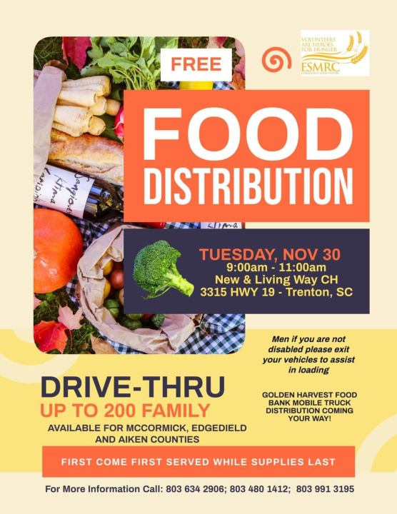 TRENTON, S.C. (WJBF) — Golden Harvest Food Bank Mobile Truck will hold a food distribution event on Tuesday, November 30.
