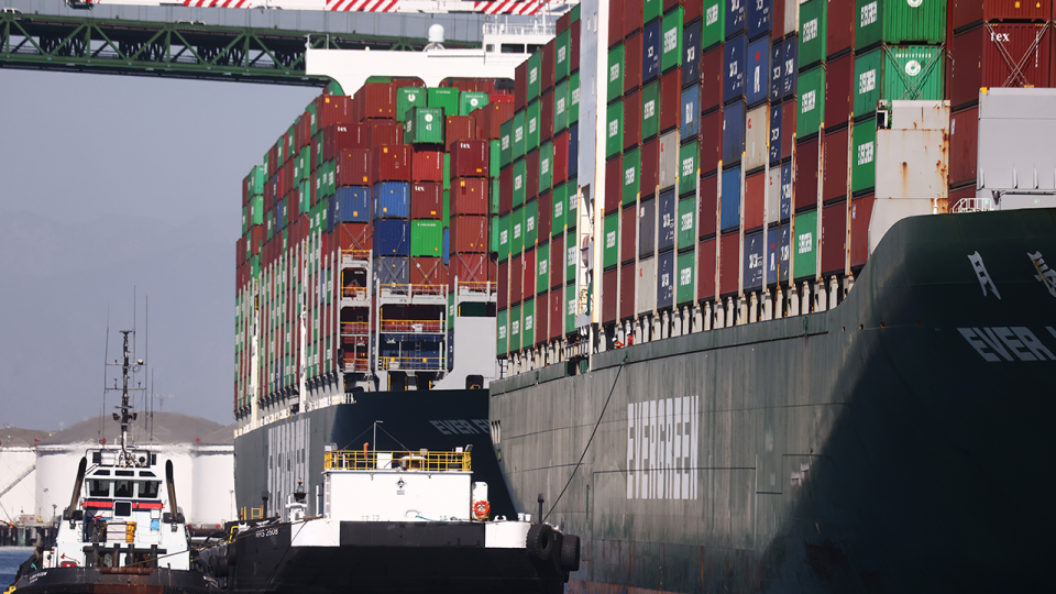 Shipping containers are unloaded from ships at a container terminal at the Port of Long Beach-Port of Los Angeles complex in Los Angeles, April 7, 2021. (REUTERS/Lucy Nicholson/File Photo / Reuters)