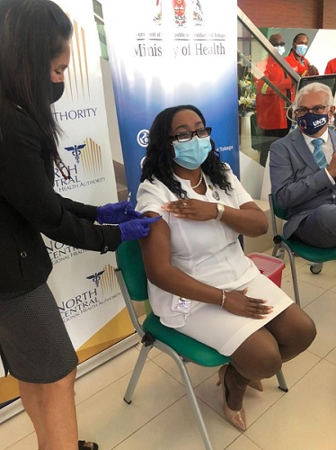 Photo: Nurse Keisha Gomes Prevatt gets T&T’s first Covid-19 vaccine.