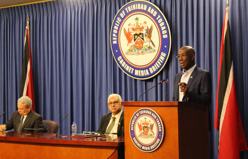 Photo: Prime Minister Dr Keith Rowley (right) addresses the media while Minister of Health Terrence Deyalsingh (centre) and Minister of Finance Colm Imbert look on.