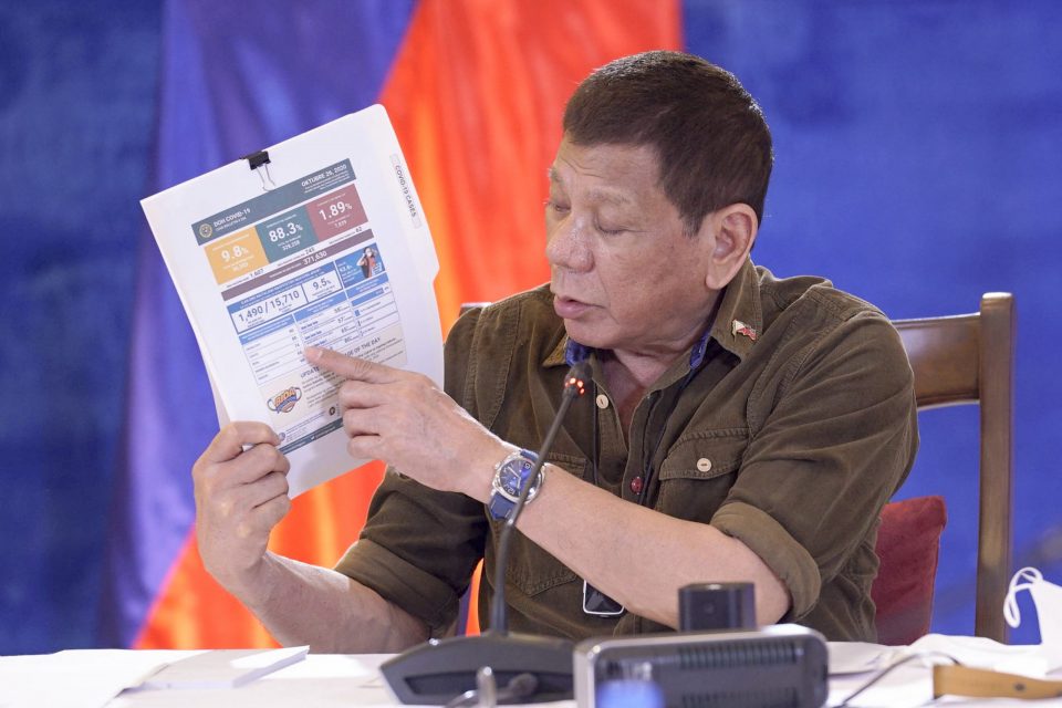 President Rodrigo Roa Duterte shows a document while holding a meeting with the Inter-Agency Task Force on the Emerging Infectious Diseases (IATF-EID) core members at the Matina Enclaves in Davao City on October 26, 2020.