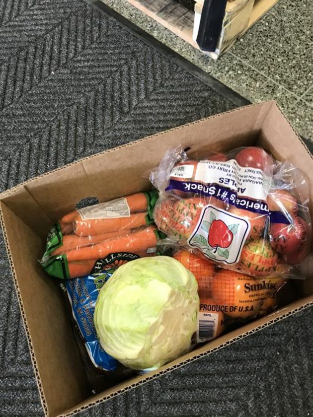 Each 20-pound box includes a four-pound bag of oranges, a five-pound bag of potatoes, three pounds of apples, three pounds of onions, two pounds of carrots, and three pounds of a green vegetable such as broccoli, green cabbage or peppers.