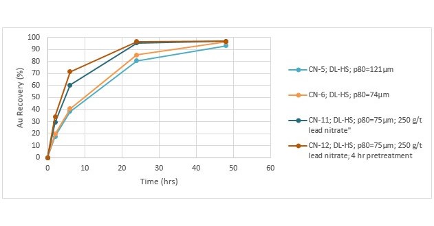 - Increased cyanide concentration yielded a slight increase in gold recovery (sample CN-9; 97.5%).