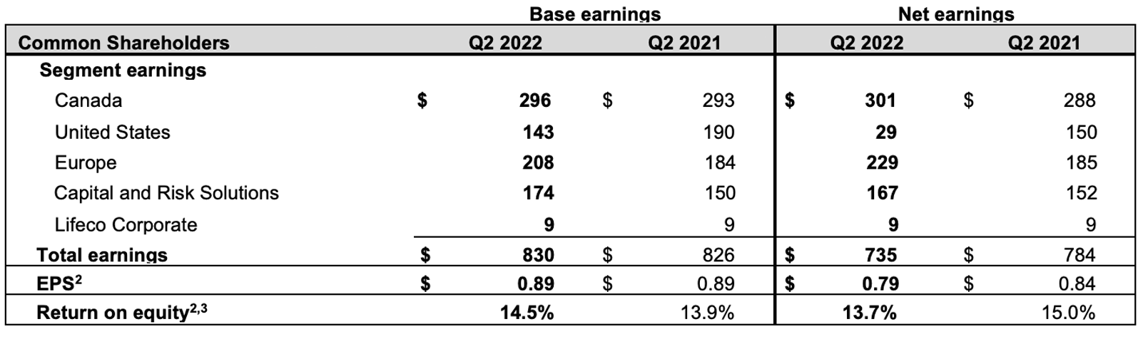 Base earnings per share (EPS) for the second quarter of 2022 of $0.89 was consistent with $0.89 a year ago. This reflected strong insurance and investment results in all geographies which more than offset reduced net fee income from wealth management businesses and negative currency movement impacts. Base earnings grew year-over-year in the Canada, Europe and Capital and Risk Solutions segments. The U.S. segment base earnings were the most impacted by market conditions resulting in lower year-over-year base earnings notwithstanding the addition of Prudential business related base earnings of $45 million (US$35 million).