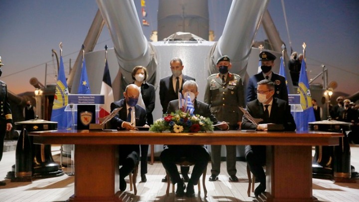 Under the procurement deal, Greece will be supplied with three Belharra frigates, with an option for a fourth. They also signed for six additional Rafale jets to the original 18. The ceremony included Greek National Defense Minister Nikos Panagiotopoulos and French Minister for the Armed Forces Florence Parly. Also attending were representatives of the two countries’ officials who signed the final agreements – including the manufacturers Naval, MBDA, Dassault Aviation – as well as the Greek Parliament president, the French ambassador to Athens, and the top officials of the Greek Armed Forces.
