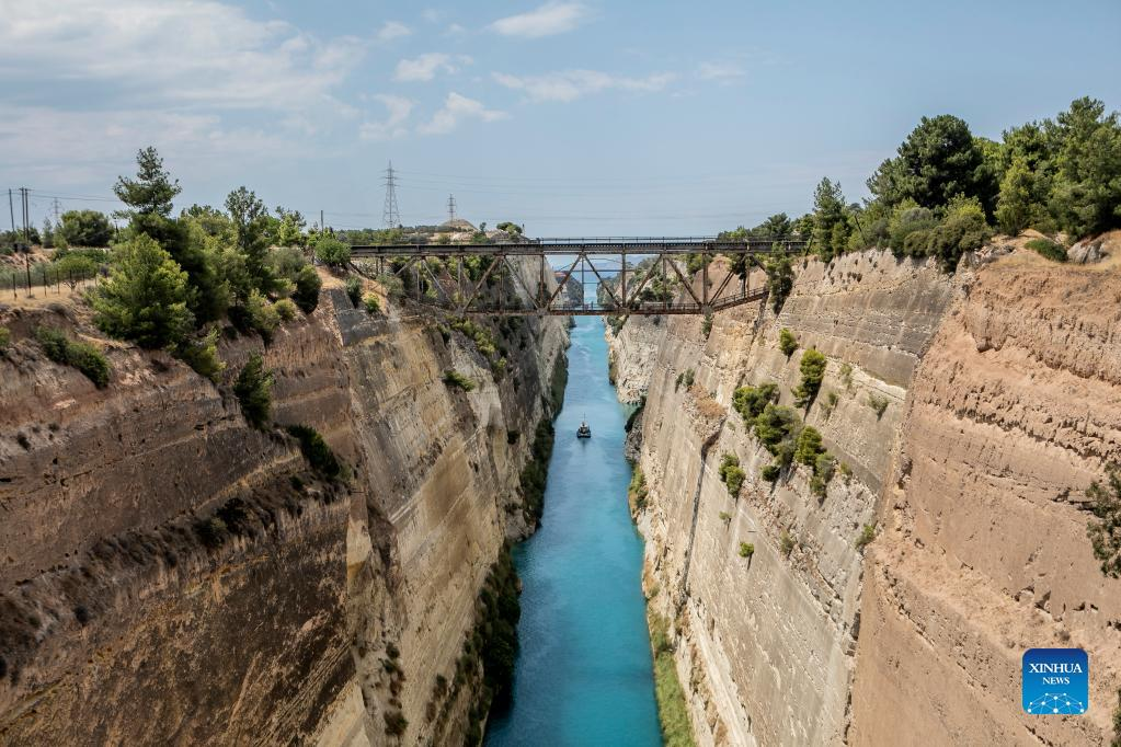 A boat sails in the Corinth Canal in Greece, on July 11, 2022. Greece’s iconic Corinth Canal reopened to shipping earlier this month after an 18-month hiatus for repair works following a series of landslides, local officials told Xinhua on Monday. (Photo by Panagiotis Moschandreou/Xinhua)