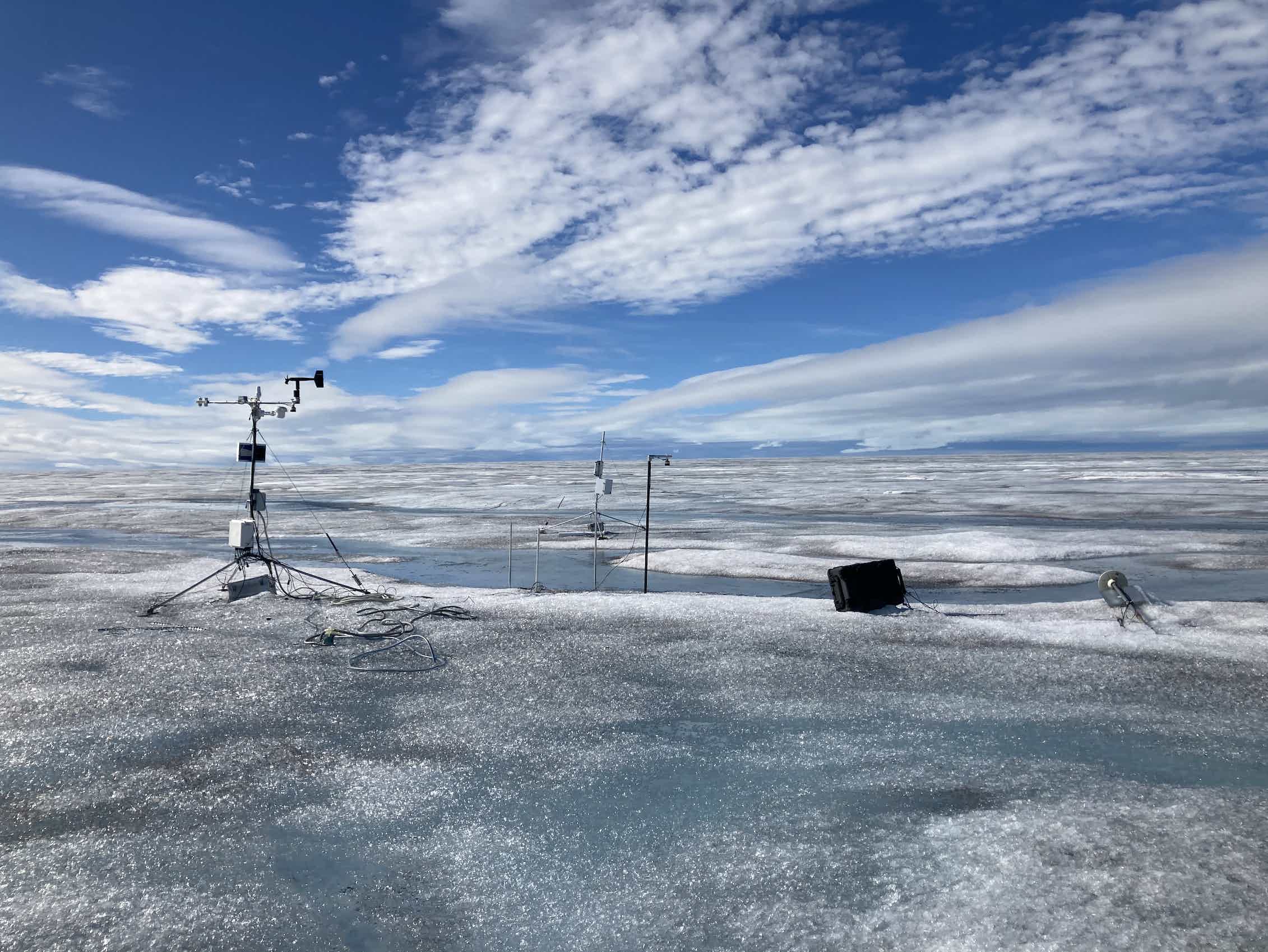 – Large tracts of the ice surface are undergoing bio-albedo darkening, which accelerates surface melt, as well as the impact of snow melting and refreezing at the surface. These darker surfaces absorb more solar radiation, driving yet more melt.