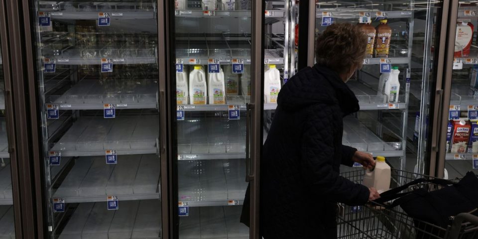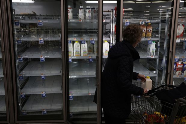 Depleted refrigerated shelves at a Giant Food supermarket in Springfield, Virginia. Grocers in the U.S. are short on labor as workers call out sick, and winter storms disrupt operations.