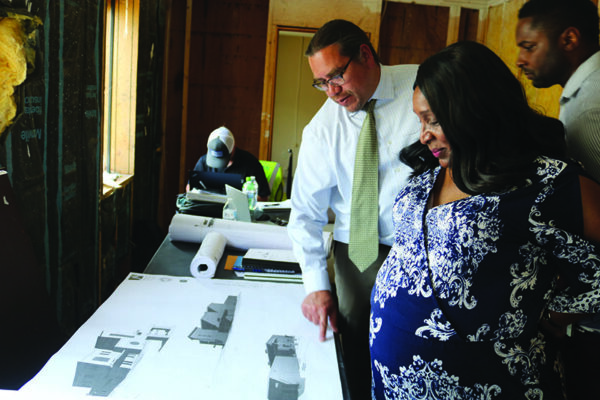 Frank Dunn Sr., Tribal Foods representative, shows plans of the building to Dr. Lilly Bouie, USDA Food & Nutrition Service regional director.