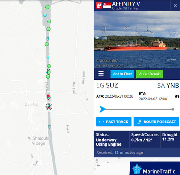 The tanker is the 114,600 dwt Affinity V registered in Singapore. The six-year-old vessel had offloaded its cargo in Portugal so it was transiting the canal with only ballast returning to Saudi Arabia to load its next cargo. The vessel is 828 feet long and currently reported to be operating with a 36.7-foot draft.