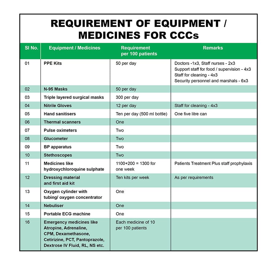a) Supply of equipments and medicines to Government managed CCC – The Karnataka State Drugs Logistics and Warehousing Society (KSDLWS) will provide the necessary equipments and medicines to Government managed CCCs. In greater BBMP area the nodal officer for CCC will send the requirement for 15 days to Additional Director, KSDLWS. In districts, DCs will manage this from the pool of equipments and medicines available with them for COVID-19.