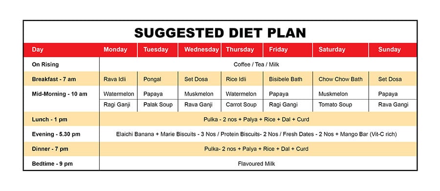 a) Nutritious diet should be provided to the patients using the suggested diet plan as per Government advice (see table below), but catering to the patient’s individual tastes, allergies and dietary requirements. Food will be delivered from the concerned patient’s home to the Centre for the staff to give to the patients. Disposable Plates and cutlery shall be used.