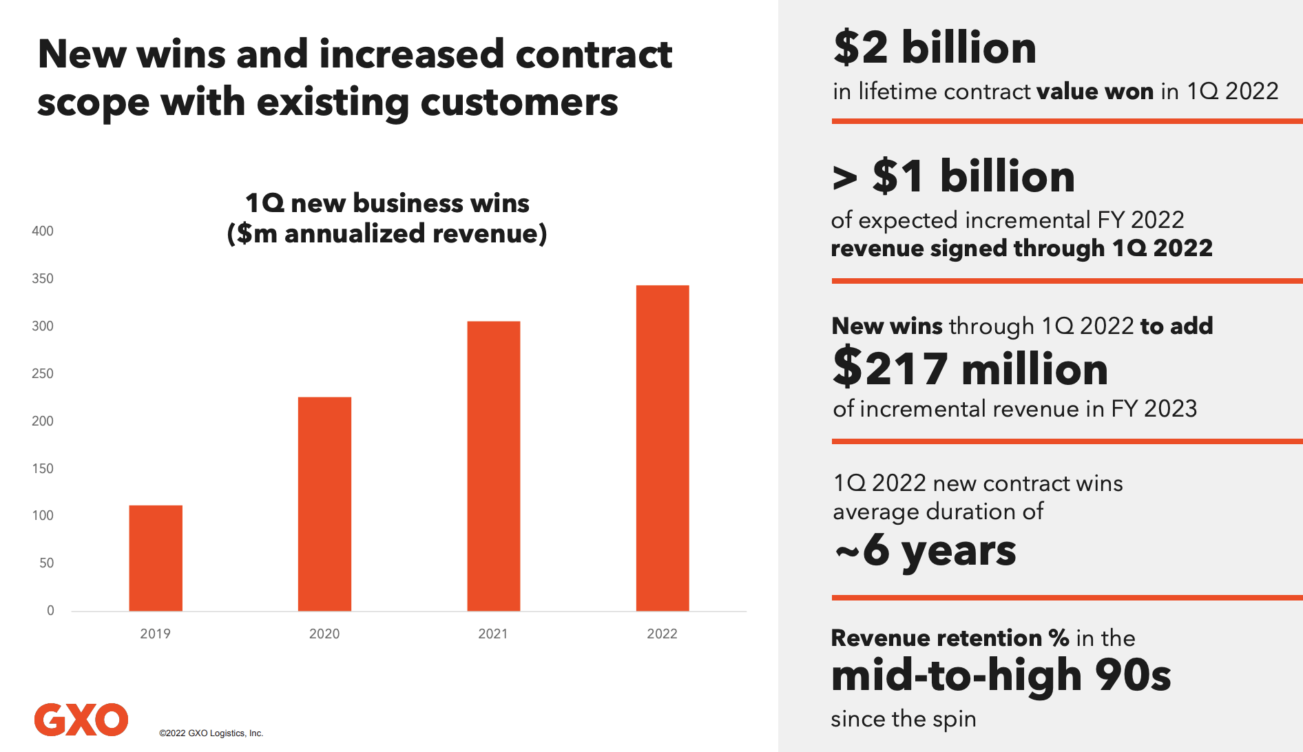 Even better, new orders are accelerating. The chart on the left side of the slide below shows new business wins in the first quarter on an annualized revenue basis. In 2019, that number was above $100 million. In 1Q22, it was close to $350 million. The average duration of these contract wins was 6% with revenue retention (%) in the mid-to-high 90s range. This matters because customers enjoy their experience with GXO as almost all of them come back – or stay with the company.
