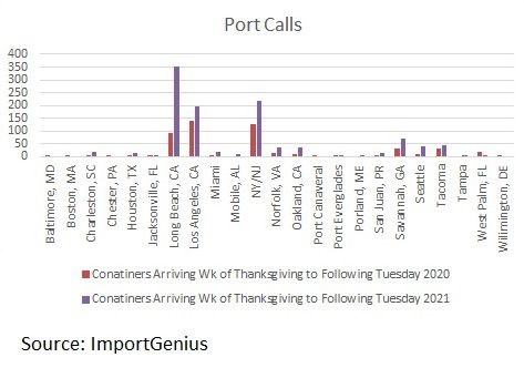 The bills of lading, compiled using ImportGenius, show the indisputable trend of this massive congestion during the weeks of Thanksgiving through the second week of December.