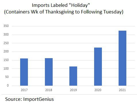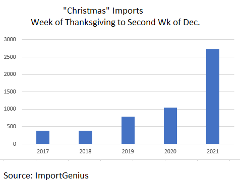 The bills of lading, compiled using ImportGenius, show the indisputable trend of this massive congestion during the weeks of Thanksgiving through the second week of December.