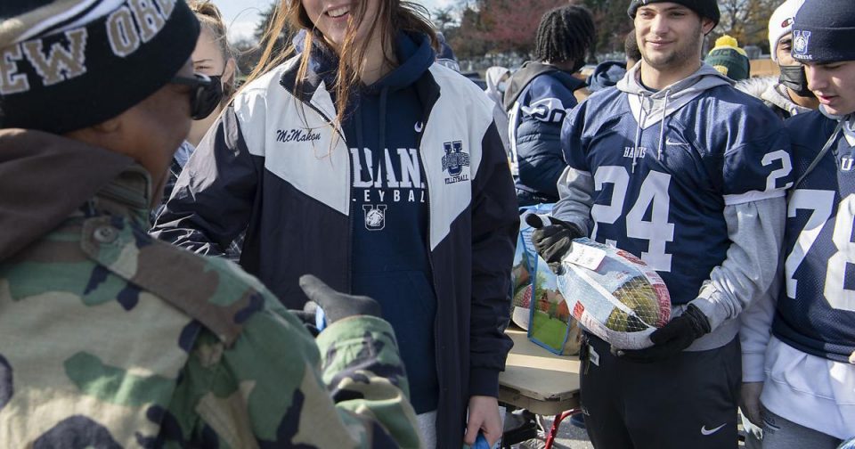 Students bundled up in Urbana’s navy blue and white colors hoisted hundreds of reusable grocery bags filled with turkeys and ingredients for Thanksgiving side dishes into the hands of those in need outside the Frederick Keys stadium that morning. Watching the distribution unfold with a grin on his face, Jefferson said he was proud of the athletes.