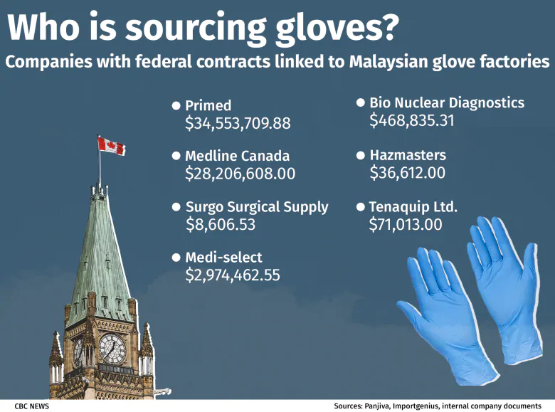 At least seven companies with whom the federal government has nitrile glove contracts worth around $66 million have links to the manufacturers Marketplace investigated, including Medi Select, Tenaquip, Hazmasters, Primed, Bio Nuclear, Surgo Surgical Supply and Medline Canada.
